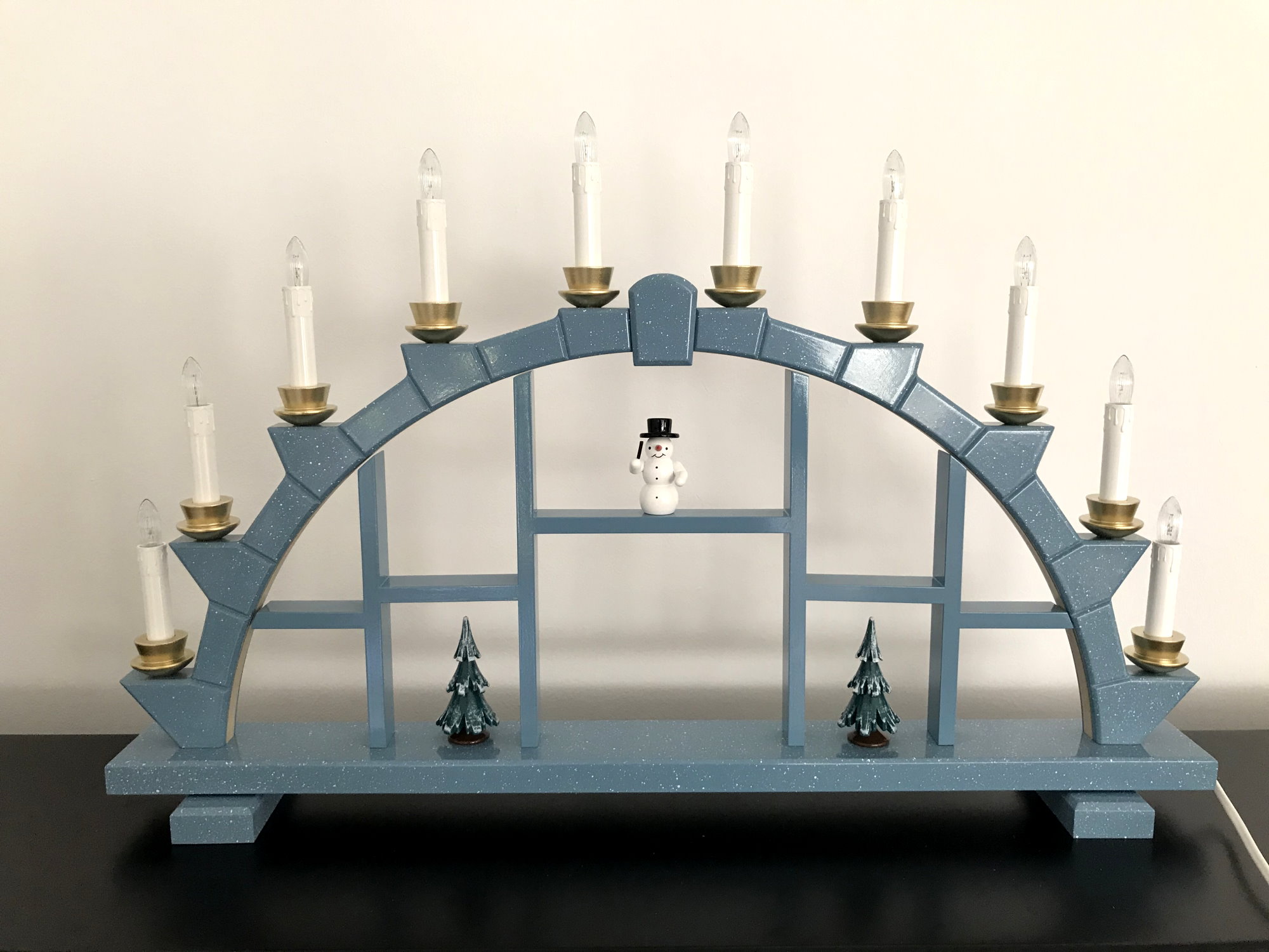 Schwibbogen aus Holz blau mit 10 elekr. Kerzen Setzkasten - 64x40 cm